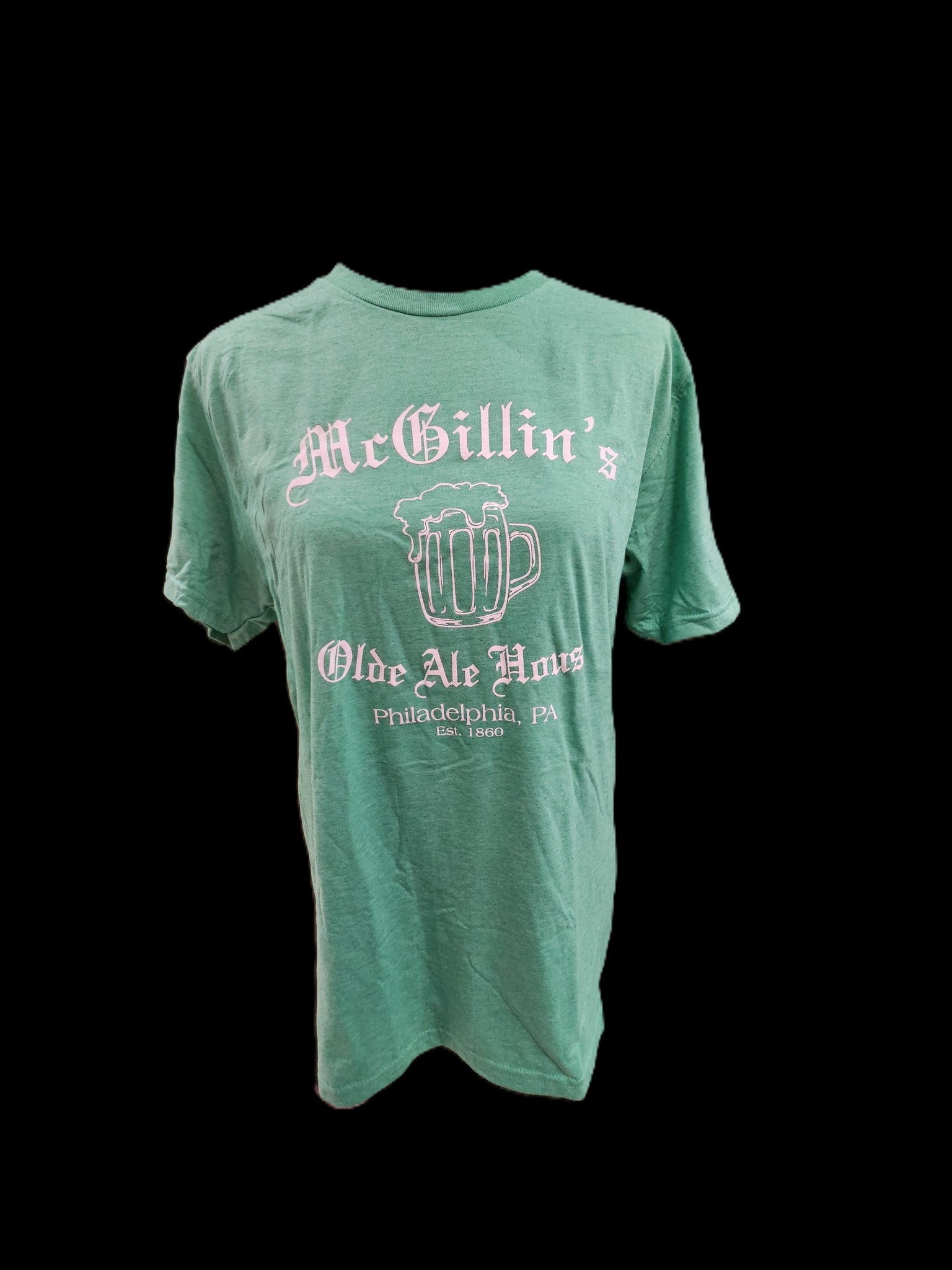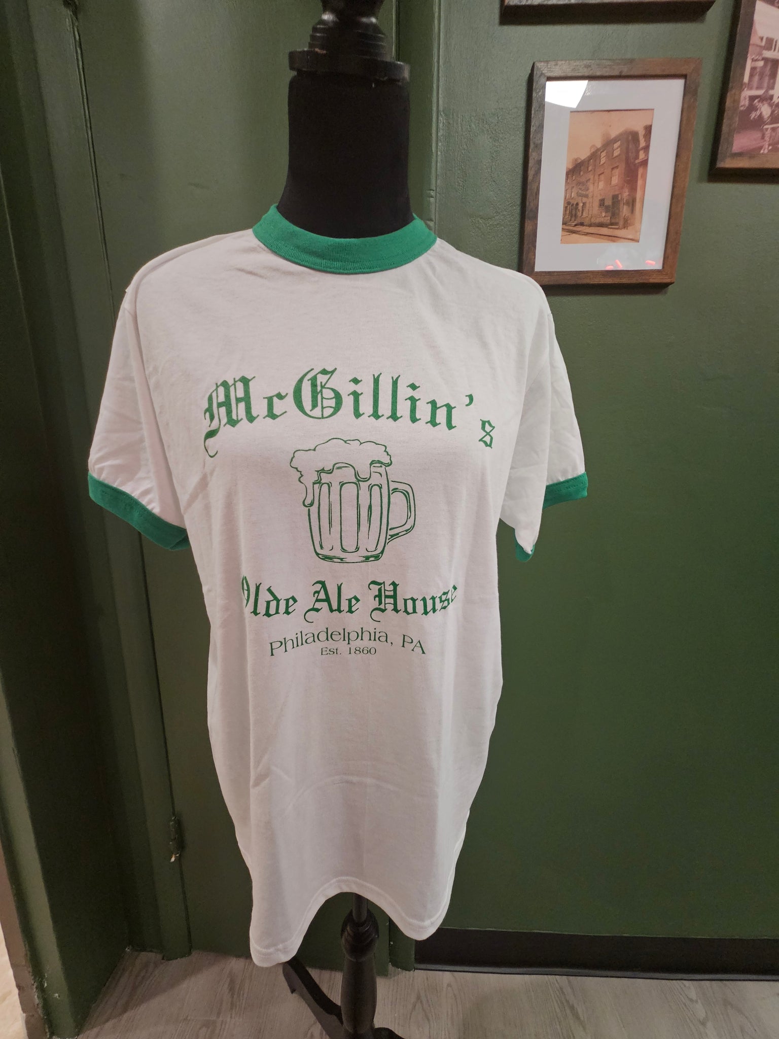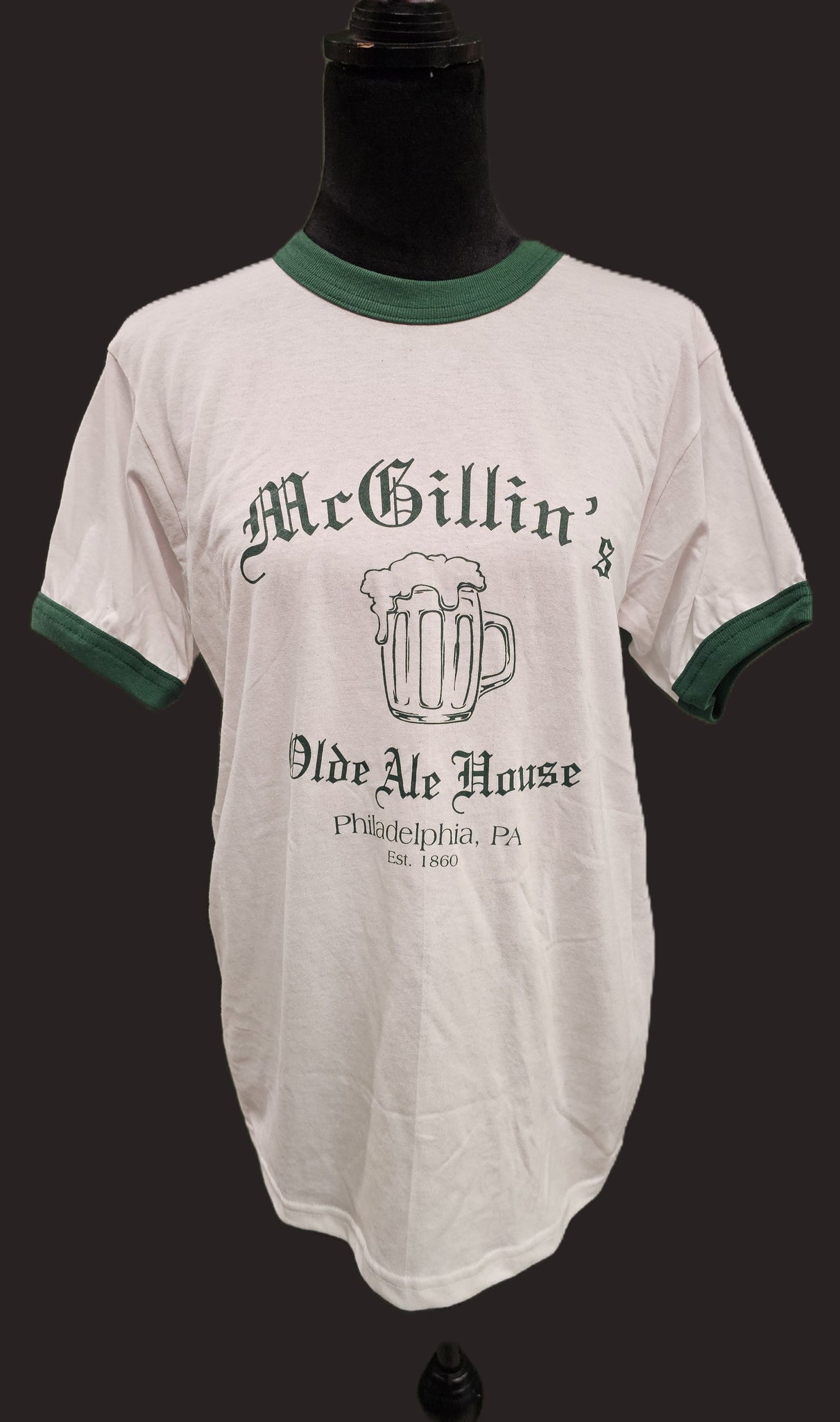 Retro t-shirt - Replicas of 1970's McGillin's swag. Available in white with green ringer or solid green tee.